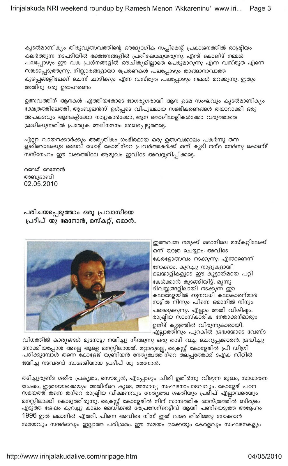 Akkare Ninnu - Vol. 6 Dt. 10.05.2010 - An exclusive NRI page written in Malayalam for www irinjalakudalive dot com